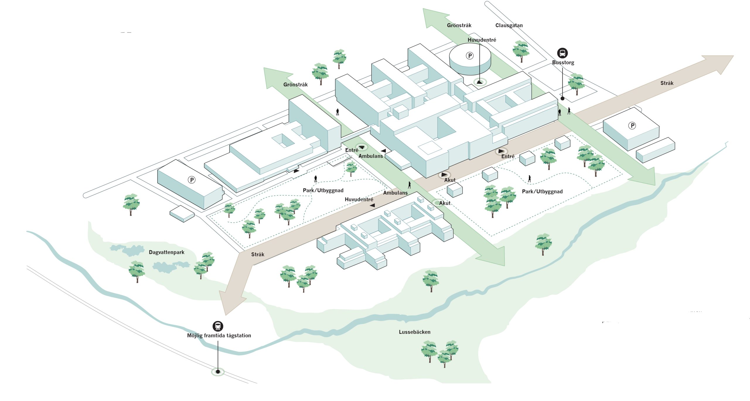 Det nya sjukhuset planeras för ett verksamhetsbehov på cirka 200 000 kvadratmeter och utformas som ett modernt, hållbart och framtidssäkrat sjukhusområde. Målet är en god vård- och arbetsmiljö, flexibilitet med möjlighet att växa över tid och ett akutsjukhus som är väl rustat för framtidens krav. Området kommer att rymma akutsjukhus med psykiatri, högteknologisk vård, vårdavdelningar, mottagningar, laboratoriemedicin, servicefunktioner och teknik samt administrativa lokaler. Även nödvändig infrastruktur, ovan och under mark, liksom park- och naturområden ingår.